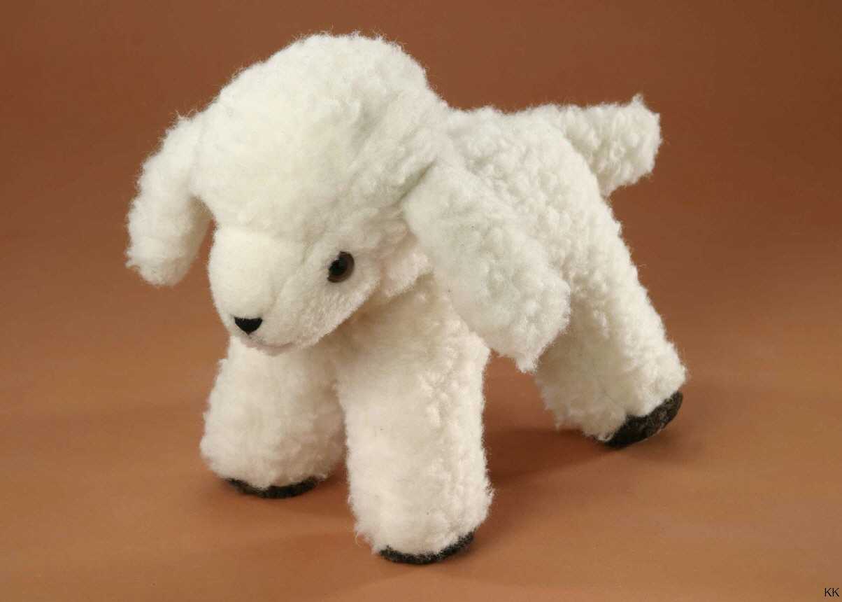 Plüsch Lamm mit und ohne Schafstimme in stehender Position, aus Schurwolle mit Schurwollfüllung. Farbe Plüsch Lamm: natur, mit brauner Sohle Größe Pluesch Lamm: 35 cm